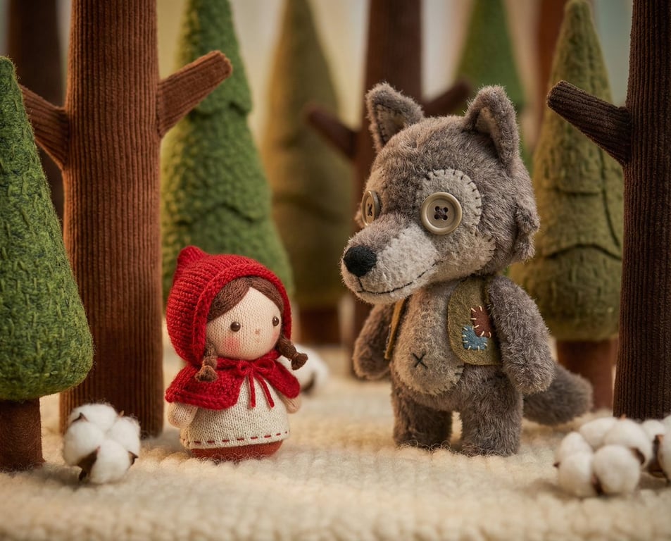 A prompt for generating a whimsical, handcrafted diorama scene of Little Red Riding Hood encountering the Big Bad Wolf in a forest. The entire scene, including characters and environment, must be constructed from tactile materials like plush toys, felt, corduroy, and wool, rendered using macro photography with a tilt-shift effect and studio lighting for a cozy atmosphere.