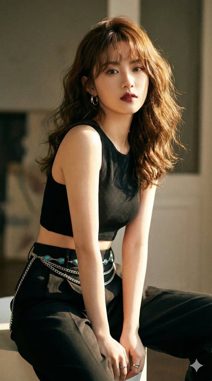 A detailed JSON prompt for generating a hyper-realistic fashion editorial portrait with a 'wild style' aesthetic. It specifies voluminous, fluffy wave hair, a confident pose with a slightly low camera angle, and a minimalist black outfit contrasted by boho-luxury accessories, focusing on golden hour side lighting and a bold deep red matte lipstick.