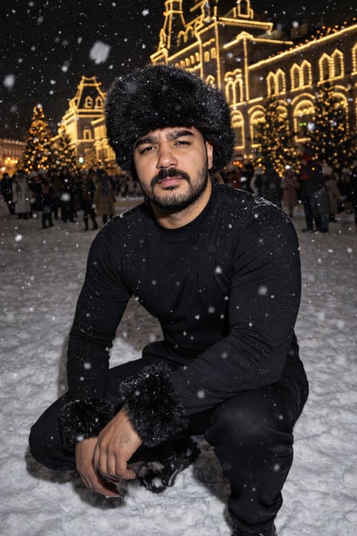 A structured JSON prompt for generating a high-contrast, raw flash realism photo. The subject is a male model with strict identity lock, kneeling in the snow near the GUM Moscow facade at night, wearing a tight black outfit and faux-fur accessories, emphasizing a Y2K candid aesthetic.