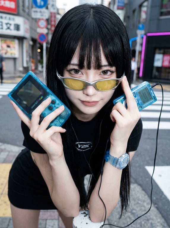 A highly detailed, structured prompt for Nano Banana Pro to generate a stunning Y2K-inspired Japanese fashion influencer character. It specifies facial features, expression, makeup, hair, clothing, accessories (like slim sunglasses and transparent blue gadgets), pose, and photography style, aiming for a high-impact Tokyo street aesthetic.