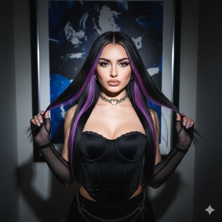 A structured prompt for generating a portrait in the aesthetic of an early-2000s digital camera flash snapshot. It details a young woman with jet-black hair and neon purple highlights, wearing a black corset top and Y2K accessories, emphasizing harsh on-camera flash lighting and a candid influencer style.