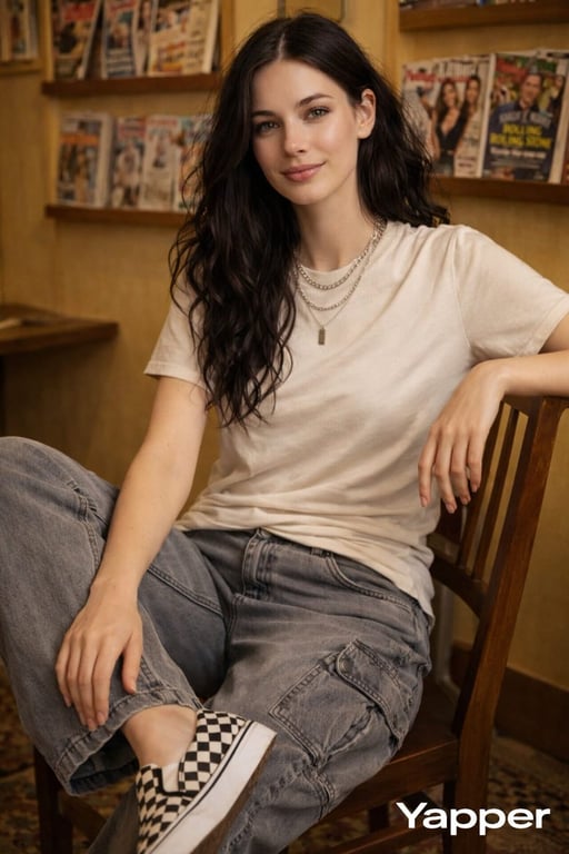 A prompt for a photorealistic fashion portrait of a young woman with black hair sitting in a retro magazine room with yellow walls and wooden shelves. The style is Y2K aesthetic, emphasizing warm cinematic lighting and ultra-detailed textures.