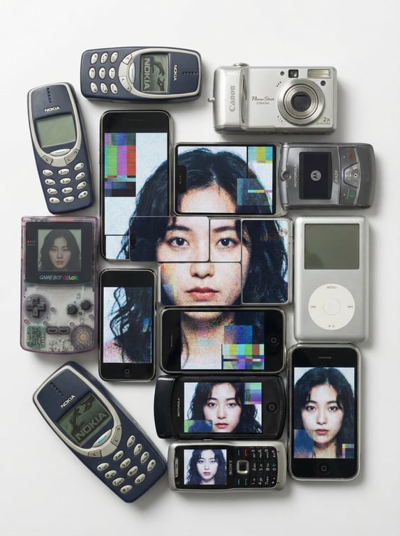 This detailed prompt generates a creative flat-lay photo collage using vintage electronic devices from the 2000s (flip phones, Game Boys, digital cameras). The screens of these devices collectively display a fragmented, low-fidelity portrait of a subject, creating a digital mosaic effect with a strong Y2K aesthetic.