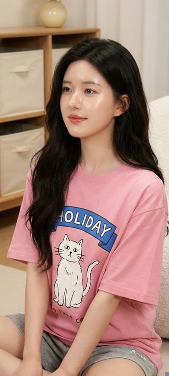 A structured prompt designed to generate images of Chinese actress Zhao Lusi in a casual, relaxed at-home setting, focusing on the 'clean girl aesthetic' and youthful playfulness. It specifies her outfit (pink 'HOLIDAY' T-shirt, grey shorts), minimalist makeup, and provides details for three different scene variations.