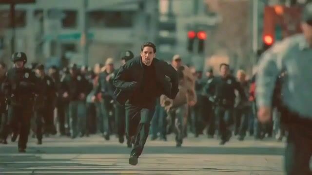 A detailed prompt for generating a dynamic video sequence. It describes a man in a black jacket running desperately down an urban street, fleeing a blurred, surging crowd of police and civilians. The camera is specified as a low-angle following shot, keeping the man centered for a frantic, action-packed scene.