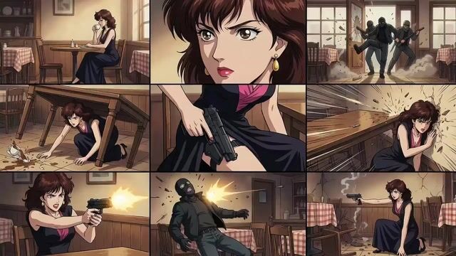 A complex prompt designed to generate an action sequence in a 90s anime style. It features a woman in a black evening dress sitting peacefully in a cafe who is suddenly ambushed by masked gunmen. The sequence details her immediate reaction of flipping a table for cover.
